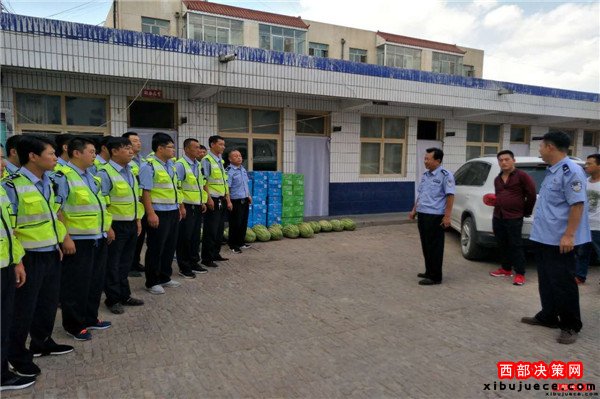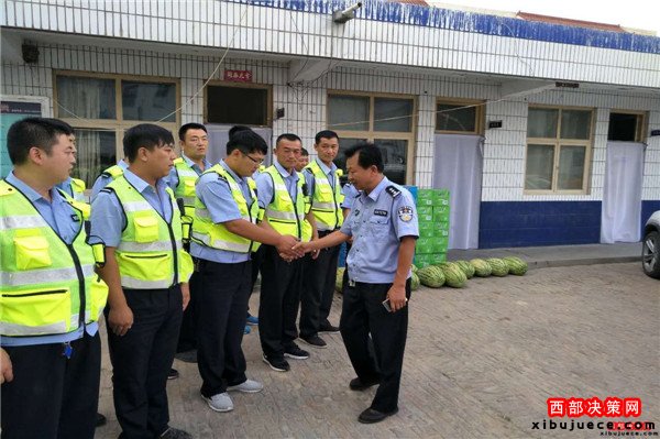西部決策網(wǎng)訊( 鄒坤 通訊員 崔春月) 時(shí)值夏日,天氣持續(xù)高溫,2016年8月10日下午,靖邊縣公安局黨委委員、交警大隊(duì)長王世崗、辦公室主任黃瑞峰等一行來到該大隊(duì)城區(qū)二中隊(duì)慰問在高溫酷熱天氣下堅(jiān)守崗位的一線民警,深刻表達(dá)了大隊(duì)黨委對(duì)一線民警的關(guān)心和關(guān)愛,并將防暑降溫物品及時(shí)送到了一線民警手中。