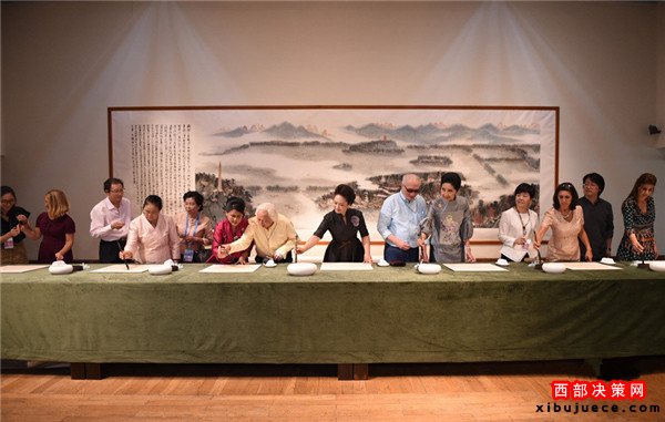 在觀看“意象中國”書畫展時,彭麗媛和來賓們在《西溪紀(jì)勝圖》、《朱荷圖軸》等經(jīng)典國畫作品前駐足觀看,接著欣賞4位著名書畫家現(xiàn)場聯(lián)袂創(chuàng)作書畫作品《江南憶》。一位書法家還為來賓們現(xiàn)場示范毛筆的執(zhí)筆、運筆方式。彭麗媛邀請來賓們一同書寫漢字“和”。她說,“和”字在漢語里具有“和平”、“和諧”之義,是我們對世界的共同心愿。來賓們饒有興致地拿起毛筆各自書寫,并展示自己的書法作品。彭麗媛說,昨晚各位在西湖邊觀看了精彩的文藝演出,今天我們在這里一同欣賞畫中的西湖。她同來賓們在國畫《西湖秋勝》前合影留念。