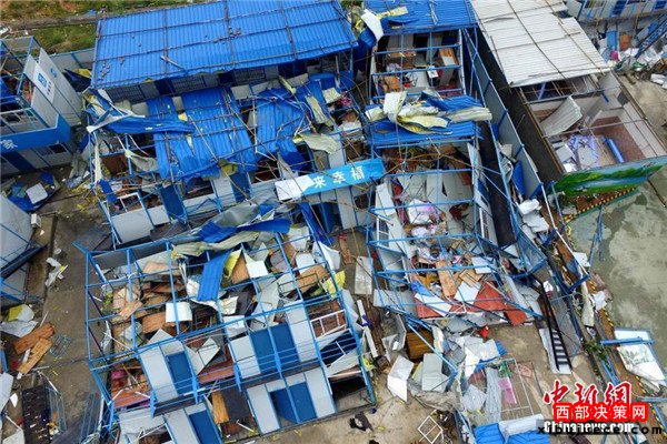 9月15日,今年第14號臺風“莫蘭蒂”于凌晨3時05分在廈門翔安沿海登陸,登陸時中心附近最大風力15級(48米/秒,強臺風級),中心氣壓945百帕。圖為航拍登陸點翔安一工地工棚被完全摧毀。