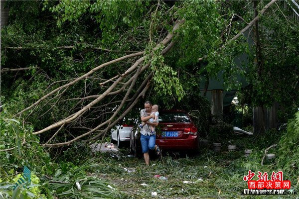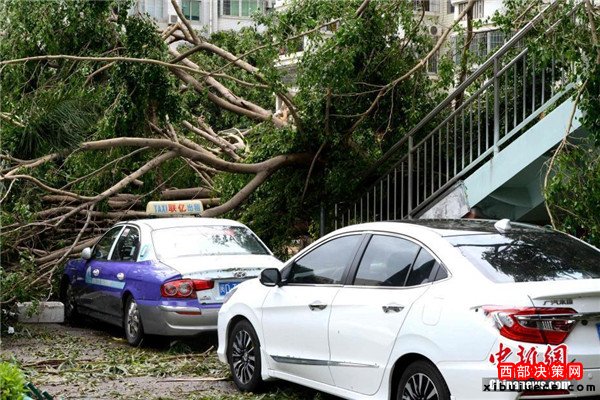 9月15日,今年第14號臺風“莫蘭蒂”于凌晨3時05分在廈門翔安沿海登陸,登陸時中心附近最大風力15級(48米/秒,強臺風級),中心氣壓945百帕。圖為廈門市區(qū)大批車輛被吹倒的樹木損壞。