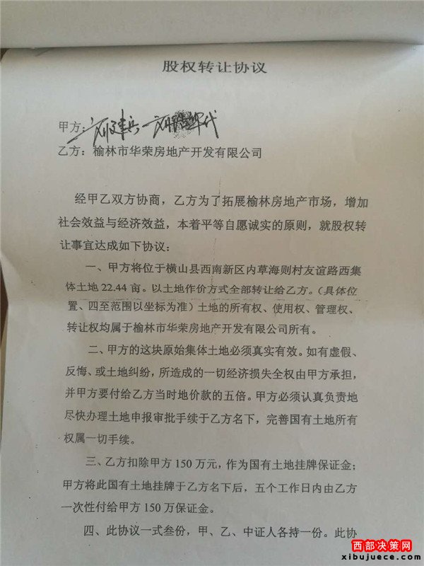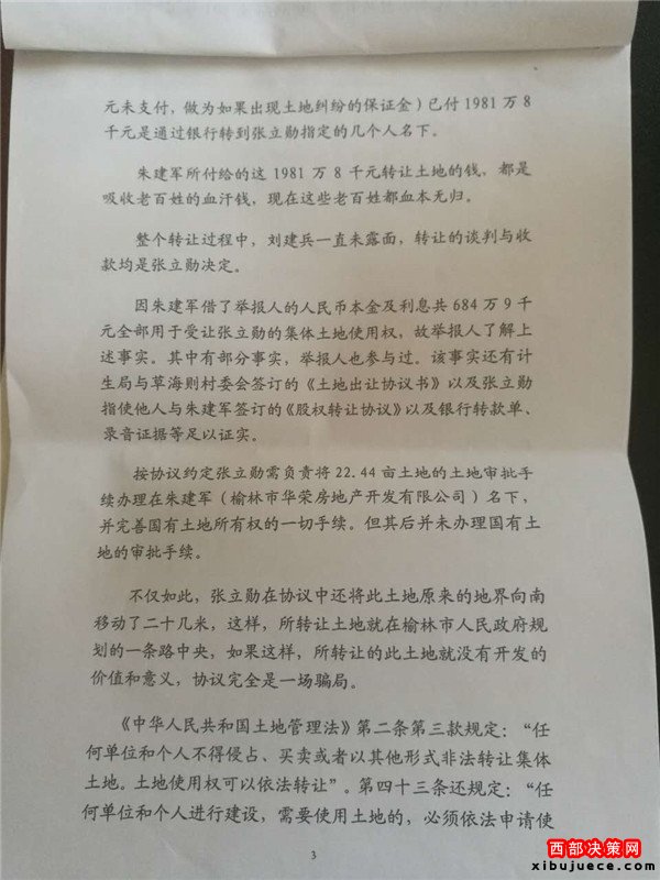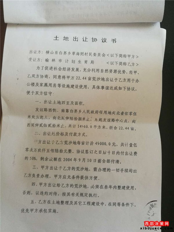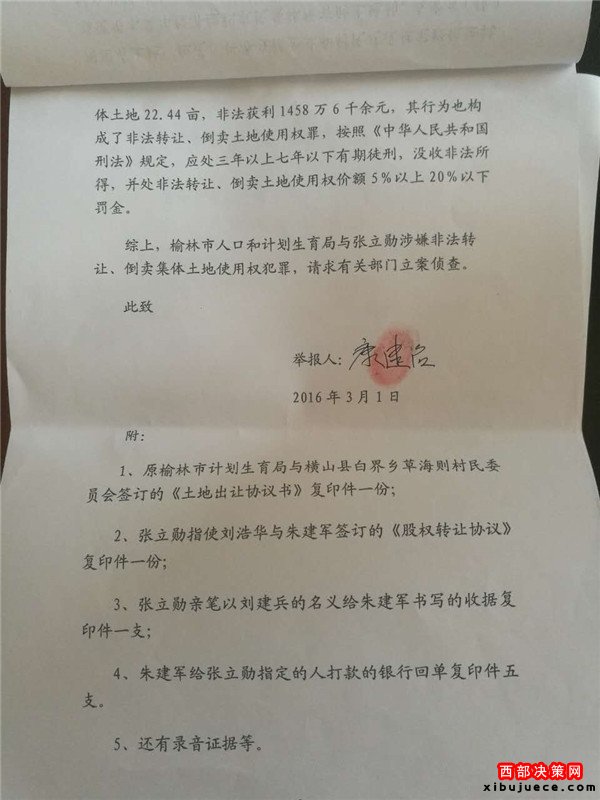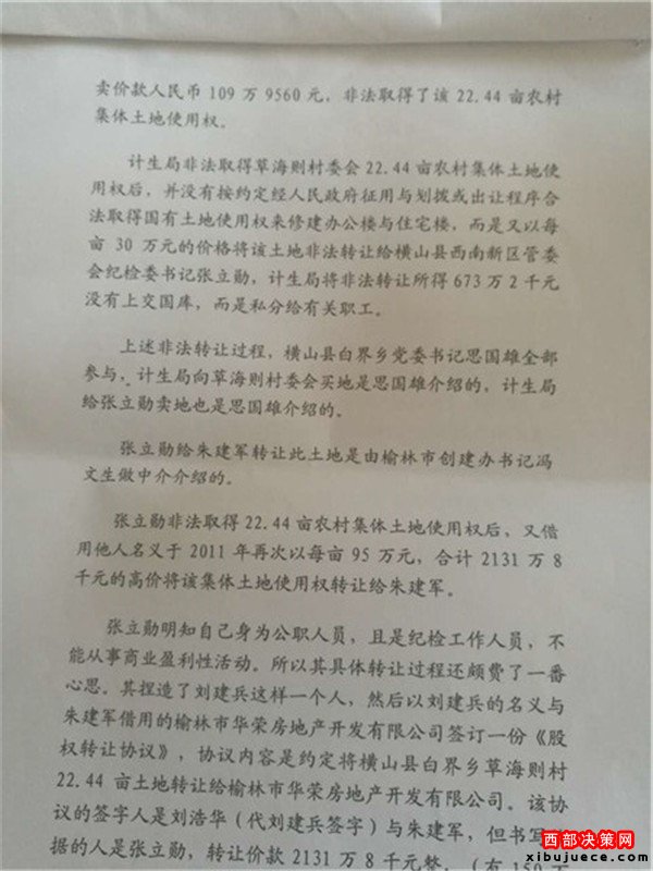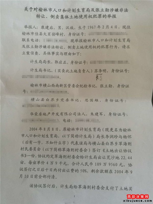 2016年9月11日本社接到:榆林市佳縣人康建啟(轉(zhuǎn)讓倒賣該土地合同的中間見證人之一)實名舉報,榆林市人口和計劃生育局(郭局長、蘇書記)、榆林市橫山西南新區(qū)管委會紀(jì)檢書記張書記、橫山縣白界鄉(xiāng)黨委書記思書記(未點名的市級領(lǐng)導(dǎo))等等涉嫌非法轉(zhuǎn)讓、倒賣集體土地使用權(quán),從中非法獲利2021.844萬元