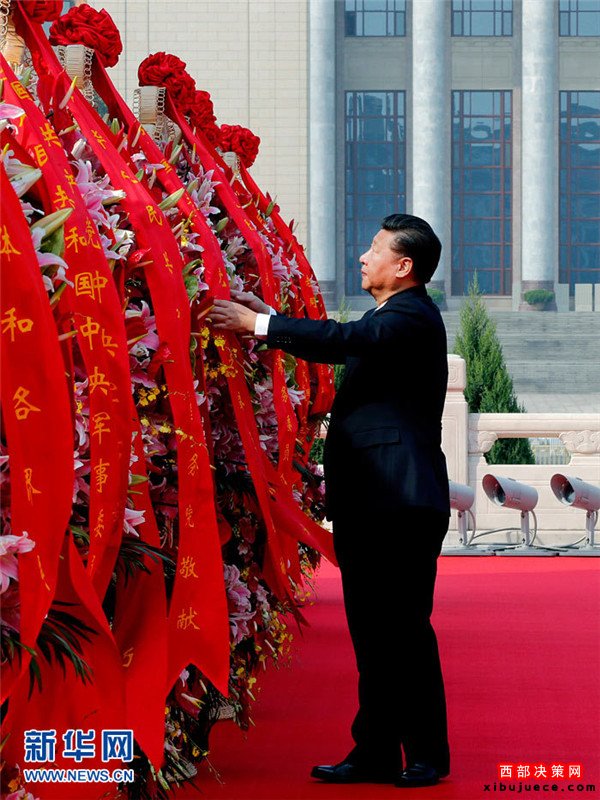 9月30日上午,黨和國(guó)家領(lǐng)導(dǎo)人習(xí)近平、李克強(qiáng)、張德江、俞正聲、劉云山、王岐山、張高麗等來(lái)到北京天安門(mén)廣場(chǎng),出席烈士紀(jì)念日向人民英雄敬獻(xiàn)花籃儀式。這是習(xí)近平整理花籃上的緞帶。新華社記者鞠鵬攝