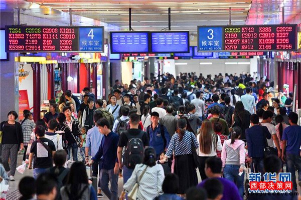 10月7日,乘客在鄭州火車站內準備進站乘車。