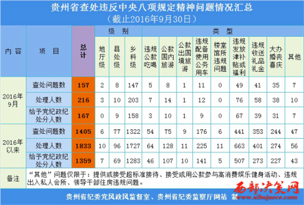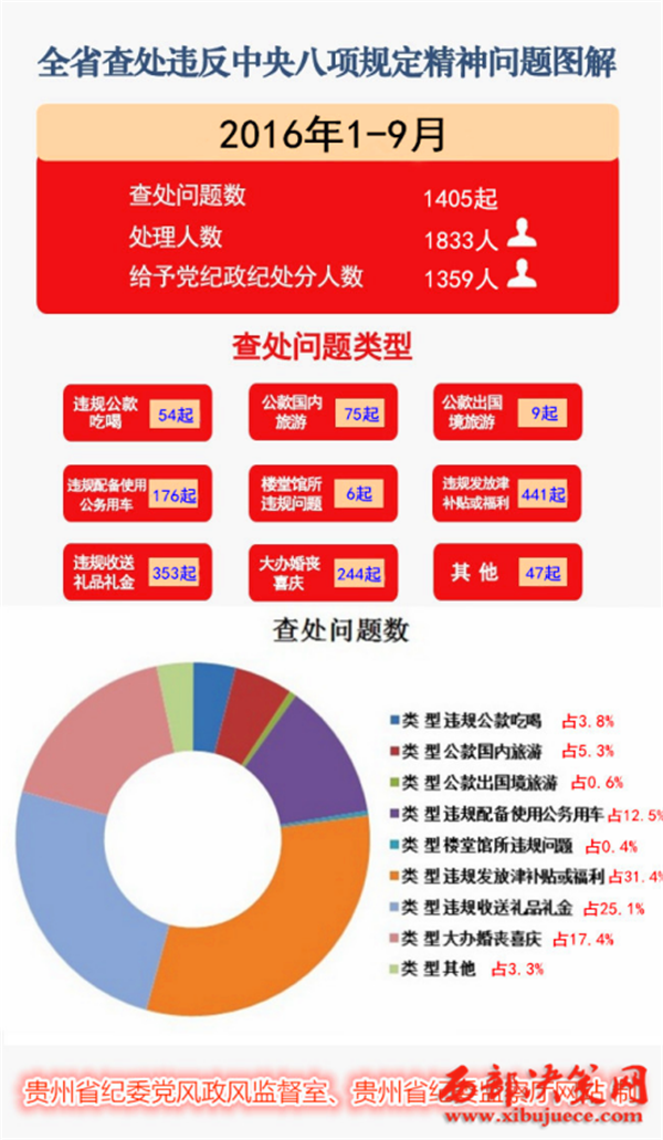 2016年1至9月,貴州省共查處違反中央八項(xiàng)規(guī)定精神問題1405起,處理1833人,給予黨紀(jì)政紀(jì)處分1359人。