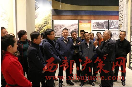 在付丹丹的講解中,黃伯韡一行走進“紅色南梁”,來到“兩點一存”主題廣場,考察組對中國地理版圖的造型設計和紅飄帶景觀布局大加贊賞,隨后陸續(xù)參觀了南梁革命紀念館、寨子灣陜甘邊區(qū)蘇維埃政府(軍委)舊址、抗大七分校校部舊址、軍民大生產基地舊址及中國延安干部學院南梁教學點。