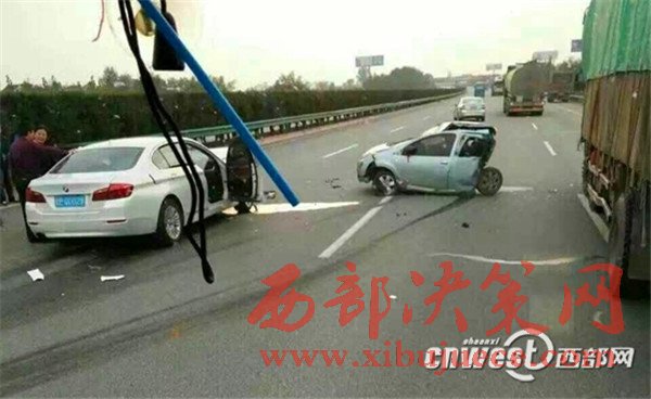 10月16日下午5點(diǎn)左右,西寶高速楊凌西至扶風(fēng)絳帳段,一輛牌照為甘EQ0029的白色寶馬小轎車與其前方行駛的一輛陜AJ835R的銀色比亞迪轎車發(fā)生追尾事故,事故造成比亞迪轎車內(nèi)乘坐的4人當(dāng)場(chǎng)死亡,寶馬轎車內(nèi)一人經(jīng)送醫(yī)院搶救無效死亡,車禍現(xiàn)場(chǎng)慘烈。