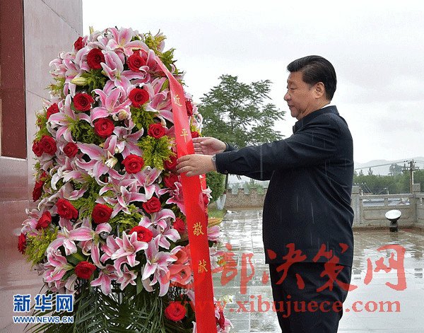 2016年7月18日至20日,中共中央總書記、國家主席、中央軍委主席習近平在寧夏調研考察。這是7月18日上午,習近平在固原市西吉縣將臺堡向紅軍長征會師紀念碑敬獻花籃。新華社記者李濤攝