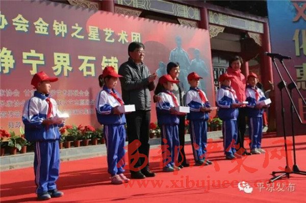 中國文聯(lián)副主席楊承志,中國音樂家協(xié)會(huì)分黨組書記、副主席、秘書長韓新安,甘肅省文聯(lián)黨組書記、副主席周麗寧向界石鋪小學(xué)捐贈(zèng)了“核心價(jià)值觀兒童歌曲”光碟和兒童樂器。演出中,蘭州演藝集團(tuán)表演了群舞《鼓舞隴原》,王二妮演唱了歌曲《趕牲靈》、《高樓萬丈平地起》,周澎演唱了歌曲《美麗中國走起來》、《旗手》,平?jīng)鰶芎觿≡罕硌萘藨蚯镀經(jīng)鲰灐罚鯁囱莩烁枨冻藟?mèng)飛翔》、《軍民團(tuán)結(jié)一家親》,湯子星演唱了歌曲《信仰的光芒》、《共圓中國夢(mèng)》,吳娜演唱了歌曲《兄弟手拉手濃濃民族情》、《洪湖水浪打浪》,李進(jìn)軍表演了口技,王傳越演唱了歌曲《紅軍不怕遠(yuǎn)征難》、《我和我的祖國》,劉全和、劉全利表演了幽默小品《櫥窗模特》,呂繼宏演唱了歌曲《咱老百姓》、《甘肅老家》,宋祖英演唱了歌曲《十送紅軍》、《愛我中華》。