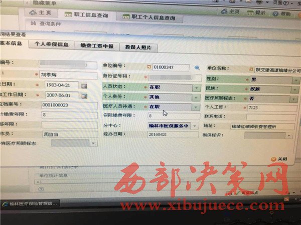為了進一步了解到底是陜西省交通集團榆靖分公司紀委部造假還是陜蒙界收費站職工(提供的考勤表上有明顯涂改痕跡,天數(shù)是28天)和站長自己(自敘錄音)一起造假。在合療辦調(diào)取查看的合療系統(tǒng)顯示,單位編號01000347,名稱陜交建高速榆靖分公司,劉某工資7123元。