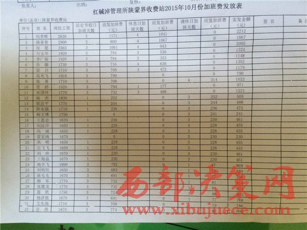 紀委王姓負責人告訴西部大開發(fā)雜志社記者菜價偏高確實從在,人已經(jīng)換掉,正在調(diào)查中,他們公司并未下過處罰,也未發(fā)現(xiàn)篡改考勤一事,不存在套取國家國有資金,并且給西部大開發(fā)雜志社記者拿出一塔資料,這就是陜蒙界收費站的考勤表,西部大開發(fā)雜志社記者看到考勤表上確實沒有任何涂改痕跡,其中陜蒙界收費站劉站長的上班天數(shù)也是23天。西部大開發(fā)雜志社記者想要查看工資發(fā)放表格時,得到結(jié)果還是無權(quán)了解。