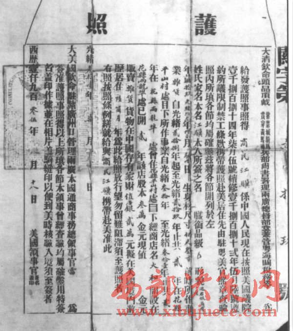這份護(hù)照共有中英文兩頁,中文頁主要介紹了江驥的家世背景、社會職業(yè)、財產(chǎn)狀況以及他本人的相貌描述。中文頁護(hù)照上特別強(qiáng)調(diào),護(hù)照持有人江驥的“右眼角有一顆黑痣”,時年19歲。對于江驥的上述信息,美國廣州總領(lǐng)事雷伏禮進(jìn)行了認(rèn)真的核對,認(rèn)為一切都屬于實情。然后,雷伏禮總領(lǐng)事在江驥的照片上加蓋美國總領(lǐng)事的“騎縫印”,以便江驥到美國舊金山海關(guān)時,核驗入境。江驥中國護(hù)照還有一份英文頁,英文頁是對中文版的翻譯說明。英文頁上同樣有兩廣總督岑春煊和美國廣州總領(lǐng)事雷伏禮的簽名。