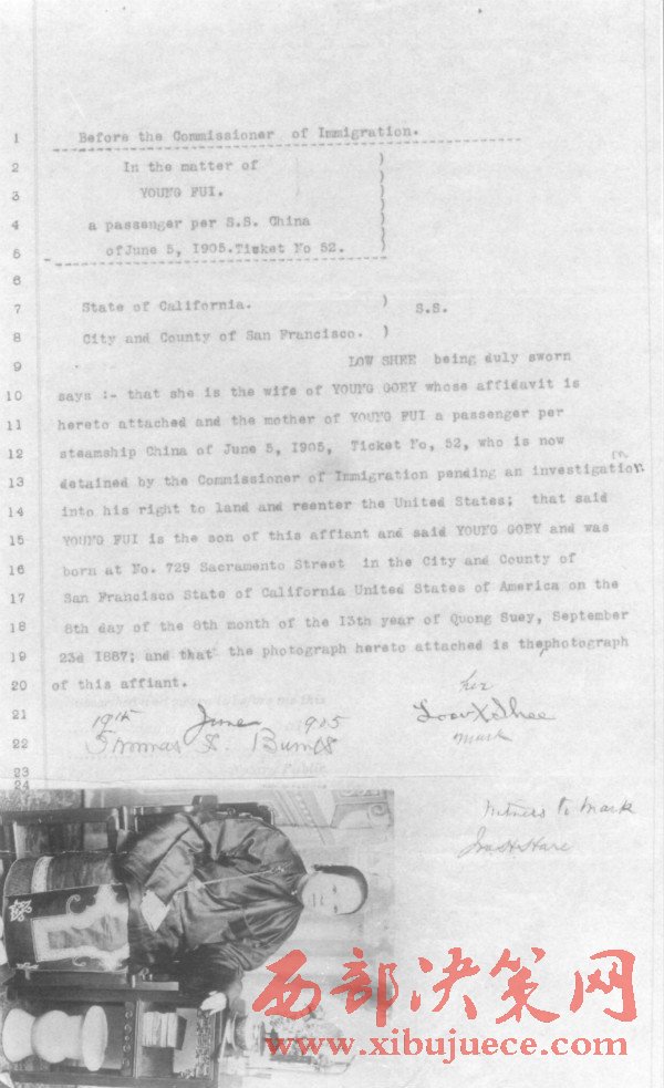 1905年6月5日,美國舊金山移民局官員對一位中國華僑的婦女入境資格的審查證明