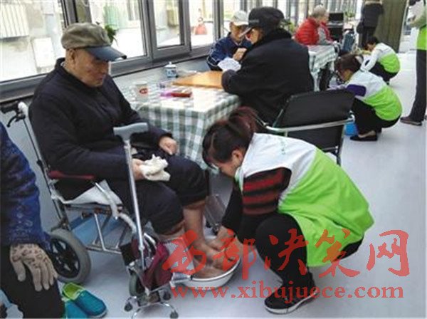 昨日,石景山樂齡“養(yǎng)老驛站”工作人員為老人洗腳。