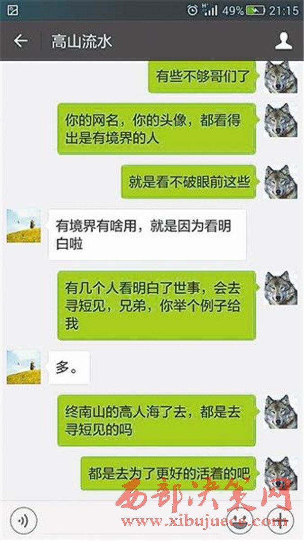 “跳樓算啦”、“堅持不了了,死了也好”……11月12日晚,身在陜西的王先生怎么也睡不著,微信里23歲邛崍小伙徐超(化名),不斷表達著自己的“死意已決”。這讓他變得緊張而擔心,他不停地通過微信發(fā)去勸說信息,同時兩次向四川警方報警,希望小伙能夠放棄輕生的念頭。而其實兩人并不相識,“只是通過一個帖子偶然結識的,甚至不知道他的名字。”王先生說。