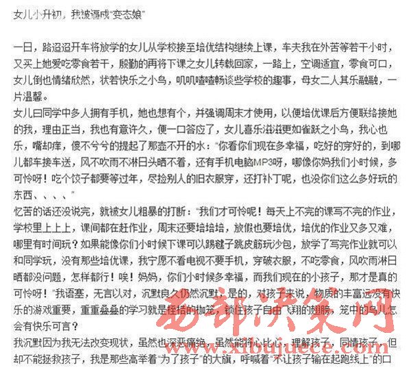 家長(zhǎng)如此不辭辛勞,背后卻也有著道不盡的苦水。武漢一位媽媽就發(fā)出了名為《女兒小升初,我被逼成"變態(tài)娘"》的帖子,講訴自己節(jié)衣縮食,卻給孩子花很多錢報(bào)各種培訓(xùn)班,控訴"變態(tài)的培優(yōu)市場(chǎng)"和不公平的升學(xué)門檻,引來(lái)許多家長(zhǎng)共鳴。
