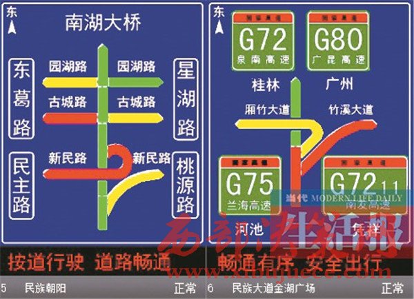 “至埌東客運(yùn)站旅行時(shí)間5分鐘”的提示,同時(shí)顯示周邊多條道路都是綠色……駕車在民族大道上會(huì)看到類似這樣的提示,這是南寧交警部門與高德地圖合作的成果。目前,高德地圖提供的實(shí)時(shí)路況交通信息已經(jīng)陸續(xù)上線南寧市交通誘導(dǎo)屏。在民族大道沿線的60塊誘導(dǎo)屏,均可以清楚地反映實(shí)時(shí)路況信息和道路擁堵狀況。