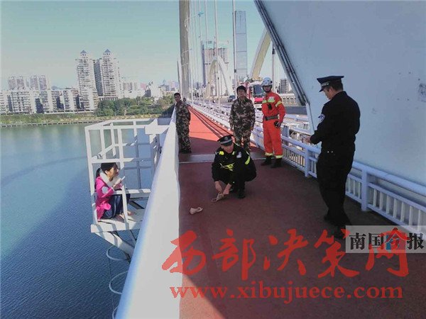 27日下午,柳州市廣雅大橋中段,有一名女子因感情問題想不開,翻越護(hù)欄想要輕生,民警和消防官兵趕到現(xiàn)場,經(jīng)過2個(gè)多小時(shí)的努力,終于抓住機(jī)會將其救下。