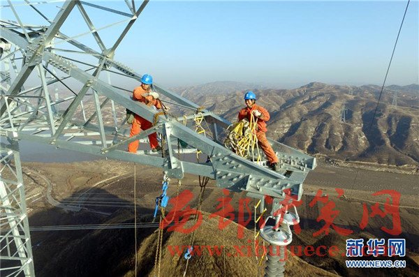 11月30日,施工人員在投放作業(yè)軟梯。當(dāng)日,正在施工的“陜電外送”特高壓工程——1000千伏榆(林)橫(山)至濰坊特高壓交流工程,在陜西省清澗縣與山西省石樓縣之間成功跨越黃河。作為落實國家大氣污染防治行動計劃重點建設(shè)的12條輸電通道之一,1000千伏榆(林)橫(山)至濰坊特高壓交流工程是首個“陜電外送”的特高壓大通道,實施后將帶動陜北煤炭高效清潔利用,減輕煤炭運輸壓力,助力陜西能源產(chǎn)業(yè)轉(zhuǎn)型升級,并有效緩解京津冀魯?shù)貐^(qū)電力供應(yīng)緊張和大氣污染。