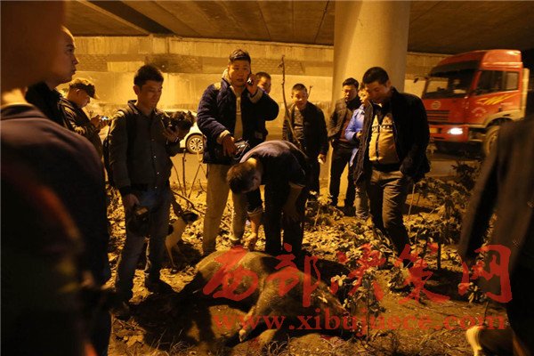 19:15,再次發(fā)現(xiàn)野豬蹤跡,它被狗攆著跑出了區(qū)政府大院,鉆到附近高速路橋下涵洞里。人群正準(zhǔn)備再次抓捕,一輛白色別克轎車(chē)駛過(guò),“二師兄”被撞出十多米遠(yuǎn),這下再?zèng)]起來(lái)。