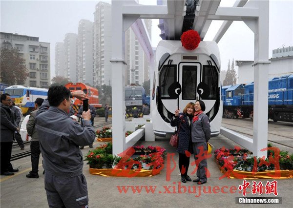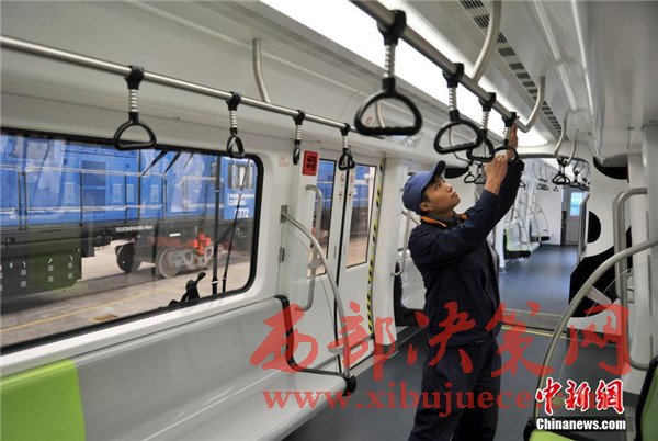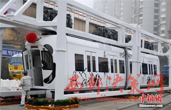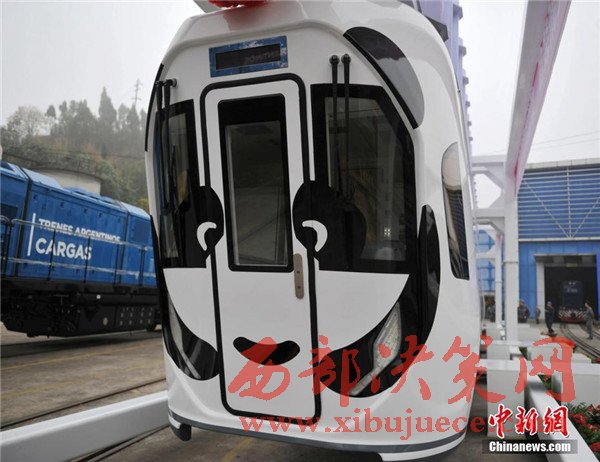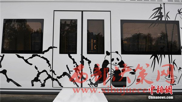 記者在現(xiàn)場看到,正式下線的空鐵車身為卡通熊貓山水圖案,酷似“熊貓”,每列定員144人,時(shí)速最高可達(dá)65公里。列車采用“大容量動(dòng)力蓄電池充放電控制技術(shù)”,通過實(shí)現(xiàn)高倍率放電,提高列車起動(dòng)加速性能及對極限環(huán)境的適應(yīng)性,同時(shí)能將400千瓦的電制動(dòng)功率全部用于動(dòng)力電池快速充電,實(shí)現(xiàn)制動(dòng)能量回收再利用,延長蓄電池續(xù)航里程達(dá)120千米。圖為車身外繪制有熊貓山水圖案。