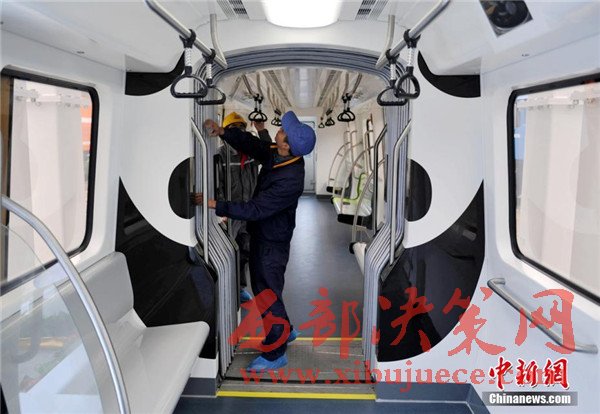 此外,列車整體結(jié)構(gòu)也采用輕量化設(shè)計(jì),全線無人駕駛,能像地鐵、動(dòng)車組一樣靈活編組。列車在懸掛裝置設(shè)有兩級保護(hù),還在駕駛室內(nèi)設(shè)有緊急逃生筒和故障救援門,可實(shí)現(xiàn)縱向、橫向及垂向的三維救援,確保了突發(fā)情況下乘客的安全。圖為車廂內(nèi)也繪有“熊貓”圖案。