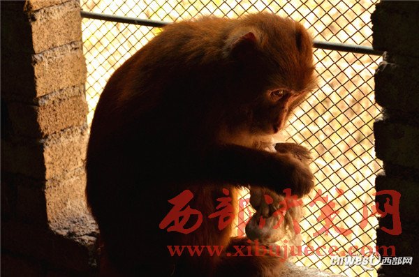 2016年12月8日,左前臂手術(shù)后的獼猴跳到寧強(qiáng)縣野生動(dòng)物救助中心的窗戶上警惕地看著工作人員。