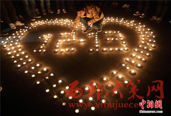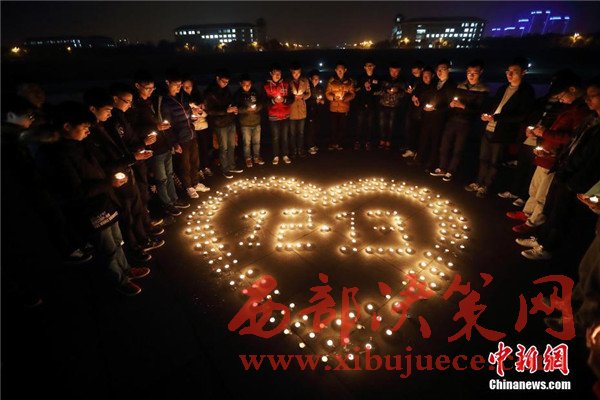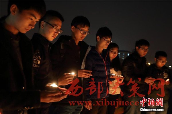 12月12日晚,在第三個國家公祭日前夜,主題為“愿逝者安息,為生者祈福”的燭光祭活動在南京東南大學九龍湖校區(qū)內舉行,來自該校機械工程學院的大學生們點燃蠟燭,擺放成心形和1213字樣,為南京大屠殺死難者集體默哀,寄托哀思。