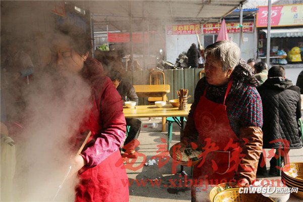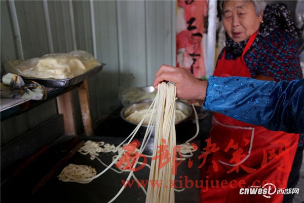 西安南二環(huán)附近的一條小巷里,新安醫(yī)院門口,70歲的賀玉蘭老人和兒媳劉艷寧在她們的實(shí)惠面館里忙碌著,揉面、拉條子、下面、給食客端面,婆媳倆默契得就像一個人,“二人成一心,黃土變成金。” 賀玉蘭老人喜歡老家蒲城的這句老話。