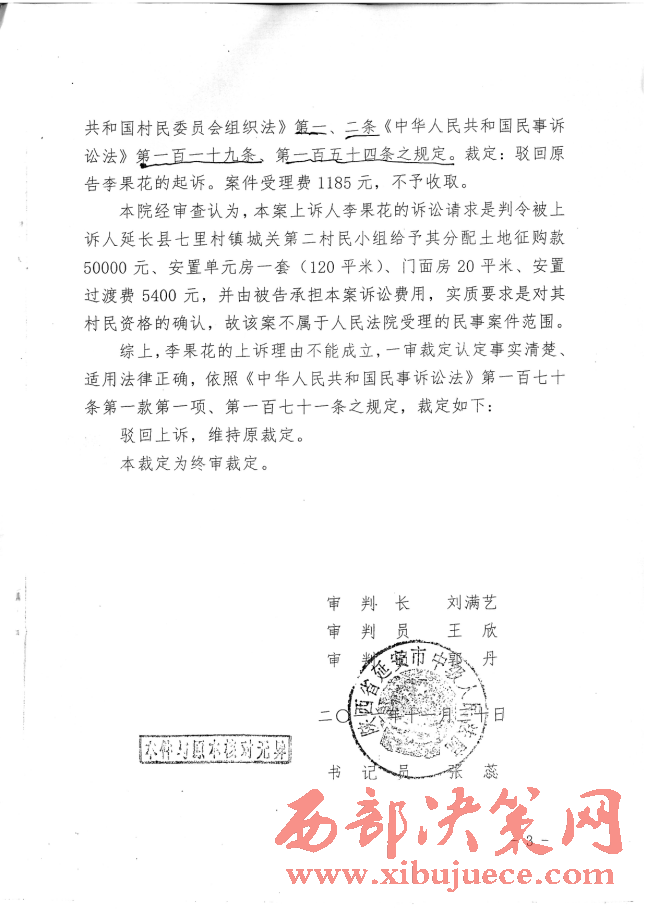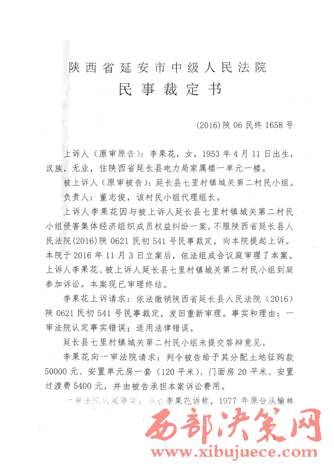 記者又多次翻閱了延長(zhǎng)縣人民法院(2016)陜0621號(hào)民初541號(hào)民事裁定書和延安市中級(jí)法院(2016)陜06民終1658號(hào)民事裁定書,兩級(jí)法院都用同樣的理由是:“李果花的訴訟請(qǐng)求是判令被上訴人延長(zhǎng)縣七里村鎮(zhèn)城關(guān)二村民小組給予其分配土地征購(gòu)款50000元,安置單元房一套(120平米),門面房20平米,安置過渡費(fèi)5400元,并由被告承擔(dān)案件訴訟費(fèi)用,實(shí)質(zhì)要求是對(duì)其村民資格的確認(rèn),故該案不屬于人民法院受理的民事案件范圍。”一審法院駁回起訴,二審法院是駁回上訴,維持原判。正如反映人李果花稱:“我訴訟的是要回我合法的土地征購(gòu)款、安置房、門面房、安置過渡費(fèi)。村民的資格確認(rèn),我有的合法的戶口簿、身份證,又有鎮(zhèn)政府領(lǐng)導(dǎo)、村干部、村民代表的協(xié)議書還不夠嗎?”