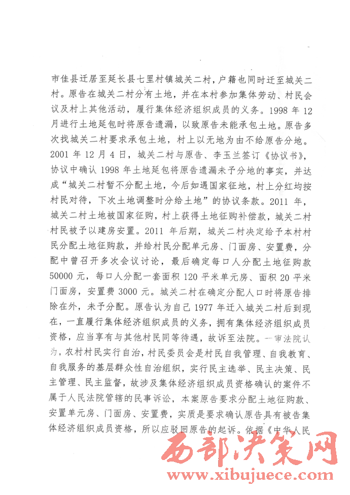 西部決策網(wǎng)訊(記者 封營(yíng)庫(kù) 實(shí)習(xí)記者 李延梅)陜西延長(zhǎng)縣七里村村民李果花反映稱:“1977年我從榆林市佳縣遷居至延長(zhǎng)縣七里村鎮(zhèn)城關(guān)二村,戶籍也同時(shí)遷至城關(guān)二村。我在城關(guān)二村分有土地,并在本村參加集體勞動(dòng)村民會(huì)議及村上其它活動(dòng),履行集體經(jīng)濟(jì)組織成員的義務(wù)。1998年12月進(jìn)行土地延包時(shí)將我遺漏,以致我未能承包土地。我多次找城關(guān)二村要求承包土地,村上以無地為由不給我分地。2001年12月4日,城關(guān)二村與我、李玉蘭簽訂《協(xié)議書》,協(xié)議中確認(rèn)1998年土地延包時(shí)將我遺漏未有分地的事實(shí),并達(dá)成“城關(guān)二村暫不分配土地,今后如遇國(guó)家征地,村上分紅均按村民對(duì)待,下次土地調(diào)整時(shí)分給土地”的協(xié)議條款。2011年,城關(guān)二村土地被國(guó)家征購(gòu),村上獲得土地征購(gòu)補(bǔ)償款,城關(guān)二村村民被予以建安置房。2011年后期,城關(guān)二村決定給予本村村民分配土地征購(gòu)款,并給村民分配單元房、門面房、安置費(fèi),分配中曾召開多次會(huì)議討論,最后確定每口人分配土地征購(gòu)款50000元,每口人分配一套面積120平米單元房,面積20平米的門面房,安置費(fèi)5000元,城關(guān)二村在確定人口時(shí)將我排除在外,未予分配。我認(rèn)為自己1977年遷入城關(guān)二村后到現(xiàn)在,一直履行集體經(jīng)濟(jì)組織成員的義務(wù),擁有集體經(jīng)濟(jì)組織成員資格,應(yīng)當(dāng)享有與其他村民同等待遇,故訴至延長(zhǎng)縣人民法院要求判令城關(guān)二村給予我分配土地征購(gòu)款50000元,安置單元房一套(120平米)、門面房20平米,安置過渡費(fèi)5400元。但被延長(zhǎng)縣人民法院以涉及集體經(jīng)濟(jì)組織成員資格的案件不屬于人民法院管轄的民事訴訟,駁回起訴。我又上訴至延安市中級(jí)人民法院,但又用同樣的理由又被駁回上訴。我該怎么辦?真的天下烏鴉一般黑嗎?我訴訟的是要回屬于我的征地款、安置房、過渡費(fèi),我有合法的戶口簿、身份證。又有延長(zhǎng)縣城關(guān)鎮(zhèn)政府副鎮(zhèn)長(zhǎng)張世杰、包村片長(zhǎng)趙華強(qiáng)、包村干部白醫(yī)學(xué)、城關(guān)村村主任(二村村民)董志軍、二村村長(zhǎng)趙金星,原二村會(huì)計(jì)王連平,原二村代表老村長(zhǎng)丁興元,在鎮(zhèn)政府會(huì)議室簽訂的協(xié)議書。難道我的村民資格還要確認(rèn)嗎?我村村長(zhǎng)董志軍的兒子董飛戶口也不在我村,又是公務(wù)員,現(xiàn)任延長(zhǎng)縣紀(jì)律檢查委員會(huì)案件審理室主任,還有村長(zhǎng)董志軍他父親。董長(zhǎng)春早已去世,但也同樣分的征地補(bǔ)償款,安置單元房,安置過渡費(fèi)。望你們新聞媒體深入調(diào)查,將事實(shí)公布于眾,為我申冤,維護(hù)我的合法權(quán)益。”