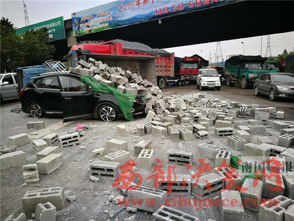 12月24日中午,在柳州市柳長路北外環(huán)立交橋底,一輛寶駿越野車準備掉頭時,后方一輛運磚車剎不住導致翻車,一堆磚頭把這輛寶駿車埋了。