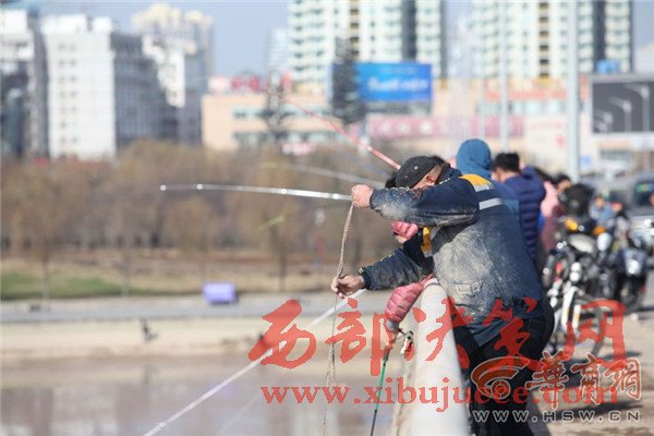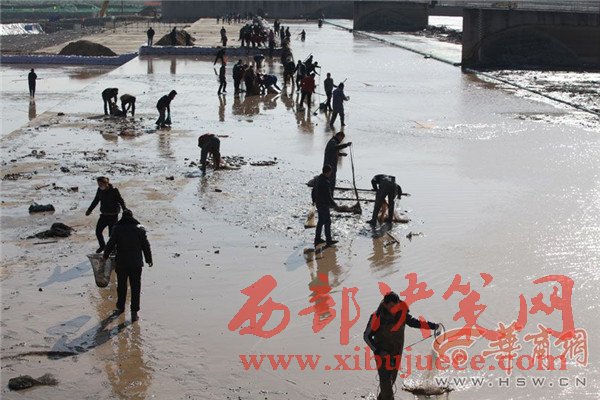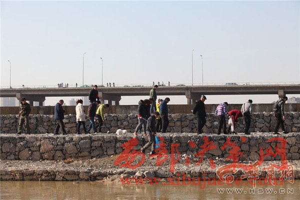 12月27日上午,咸陽湖放水剛結(jié)束,渭城橋下瞬間就變成了漁場(chǎng),數(shù)百人在橡膠壩附近撿魚捕魚,有人甚至不顧危險(xiǎn)跑到淤泥里去撈魚。咸陽湖管理處工作人員提醒,湖底淤泥情況不明,市民切勿涉險(xiǎn)下湖撈魚,以免發(fā)生不測(cè)。