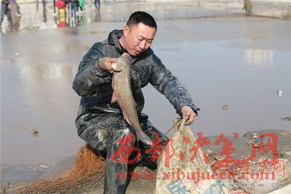 橋上釣魚人忙得不亦樂乎,橋下?lián)启~者也是爭(zhēng)先恐后。咸陽湖橡膠壩附近,不少市民拎著袋子和塑料桶在石縫里尋找殘留的小魚。比起這些撿小魚的市民,橡膠壩下面水洼處的幾名捕魚人則要更專業(yè)一些,他們下到水里,用力將網(wǎng)甩出去,一網(wǎng)子下去最少也有10多條大魚。有些人沒有撈到魚,便現(xiàn)場(chǎng)從捕魚人手里花上10元或20元,買上一條大魚心滿意足地回家去了。