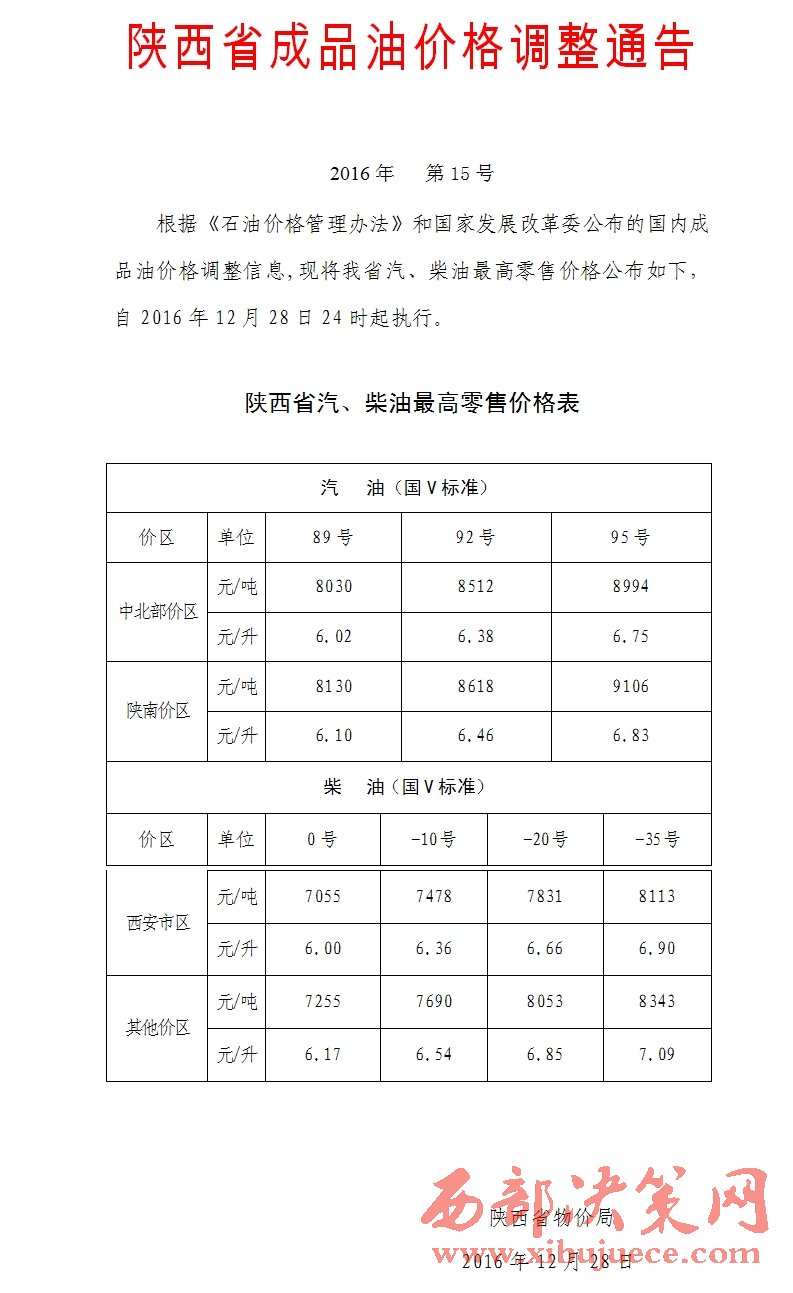根據(jù)《石油價(jià)格管理辦法》和國(guó)家發(fā)展改革委公布的國(guó)內(nèi)成品油價(jià)格調(diào)整信息,陜西省2016年12月28日24時(shí)起執(zhí)行最新的汽、柴油價(jià)格,并給出了最高零售價(jià)。