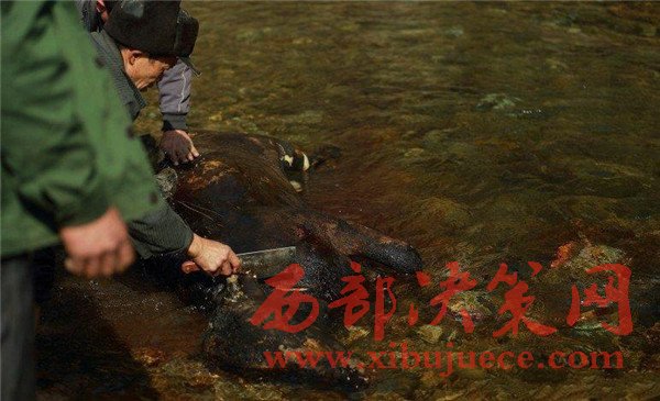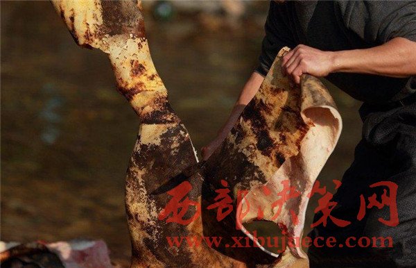 燒好的大黃牛,皮都已經(jīng)焦黃,遠(yuǎn)遠(yuǎn)的都能聞到一股燒焦的氣味。放到水里洗干凈,然后由專(zhuān)人開(kāi)膛破腹。