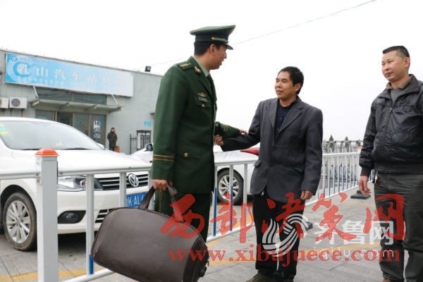 1月9日,周開樹在南黃邊防派出所為母親開具無(wú)戶籍證明后,然后帶母親來(lái)到青島,當(dāng)天下午坐上了青島至成都的火車,坐在火車上,周開樹的眼前又浮現(xiàn)出當(dāng)年的情景,一個(gè)11歲的少年,緊緊拉著母親的手:“媽媽,您別走,長(zhǎng)大后我養(yǎng)活您……”圖為周開樹與南黃邊防派出所民警見面。