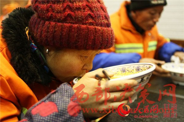 劉調萍和她的工友們每天凌晨4點就要上路打掃衛(wèi)生,清掃工作結束時已經接近6點,寒風中工作的環(huán)衛(wèi)工人們十分辛苦。“以前工作結束后,在路邊吃自己帶的飯,都是涼的。現在有了愛心早餐,工作結束能免費吃上一碗熱乎的牛肉面,特別幸福!”劉調萍高興地說道。