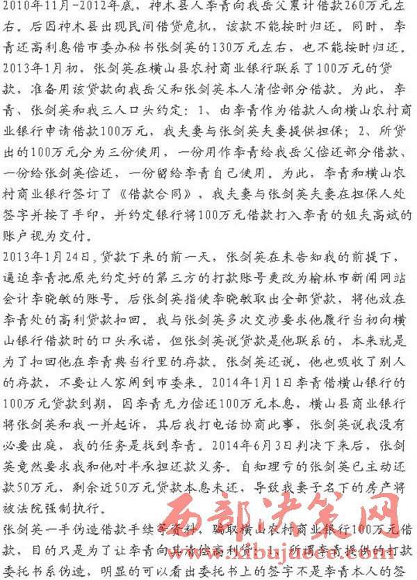 網(wǎng)友微信公眾號 江嶼濯浪爆料 2010年11月-2012年底,神木縣人李青向我岳父累計借款260萬元左右。后因神木縣出現(xiàn)民間借貸危機,該款不能按時歸還。同時,李青還高利息借市委辦秘書張劍英的130萬元左右,也不能按時歸還。2013年1月初,張劍英在橫山縣農(nóng)村商業(yè)銀行聯(lián)系了100萬元的貸款,準備用該貸款向我岳父和張劍英本人清償部分借款。為此,李青、張劍英和我三人口頭約定:1、由李青作為借款人向橫山農(nóng)村商業(yè)銀行申請借款100萬元,我夫妻與張劍英夫妻提供擔(dān)保;2、所貸出的100萬元分為三份使用,一份用作李青給我岳父償還部分借款、一份給張劍英償還,一份留給李青自己使用。為此,李青和橫山農(nóng)村商業(yè)銀行簽訂了《借款合同》,我夫妻與張劍英夫妻在擔(dān)保人處簽字并按了手印,并約定銀行將100萬元借款打入李青的姐夫高斌的賬戶視為交付。