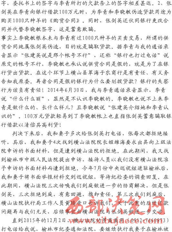 判決下來后,我和妻子多次給張劍英打電話,張每次都拒絕接聽,其后,我和妻子4次找到橫山法院院長姬雄海要求出具向上級法院申訴的書面材料,但是遭到橫山法院的拒絕。在此期間,我又找到榆林市中級人民法院提出申訴,接待人員以我們沒有橫山法院準予申訴的書面材料而遭到拒絕。今年7月份中央巡視組進駐榆林后,我和妻子將書面舉報材料交到巡視組,等待紀檢委的調(diào)查回復(fù)。在此期間,橫山法院三次傳喚我們到庭做進一步的協(xié)商解決,但是張劍英,三次拒絕到庭,有意回避,推卸責(zé)任。第三次我們到庭后,橫山法院執(zhí)行局工作人員黃騰親口告訴我們,關(guān)于此案的后續(xù)還款問題再與我們無關(guān),后續(xù)事宜由橫山法院與張劍英做進一步交涉。