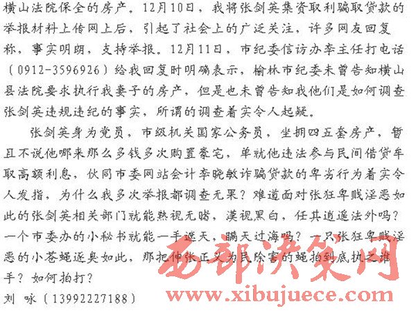 直到2015年的12月2日,橫山法院的羅某某用(0912-7660873)打電話給我說,榆林市紀委通知法院,要繼續(xù)執(zhí)行我妻子在榆林被橫山法院保全的房產(chǎn)。12月10日,我將張劍英集資取利騙取貸款的舉報材料上傳網(wǎng)上后,引起了社會上的廣泛關(guān)注,許多網(wǎng)友回復(fù)稱,事實明朗,支持舉報。12月11日,市紀委信訪辦李主任打電話(0912-3596926)給我回復(fù)時明確表示,榆林市紀委未曾告知橫山縣法院要求執(zhí)行我妻子的房產(chǎn),但是也未曾告知我他們是如何調(diào)查張劍英違規(guī)違紀的事實,所謂的調(diào)查著實令人起疑。