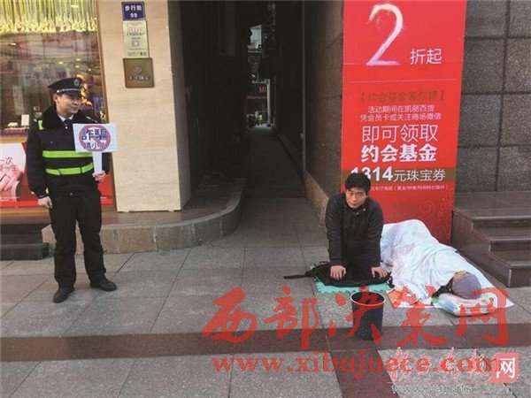 元宵節(jié)當(dāng)天,張家港沙洲路步行街一商場樓下,一名年輕男子以母親患重病為由跪地乞討,"母親"就躺在地上,旁邊站著一名城管協(xié)管員,舉起了寫著"詐騙請小心"的牌子。被攪了局的"行乞者"最后只能逃之夭夭。據(jù)當(dāng)事城管協(xié)管員介紹,乞討男子是個"熟面孔",當(dāng)天曾躲進(jìn)小弄堂里抽煙打電話,用的是蘋果手機(jī),抽的是中華煙,這讓他們更加確信,男子是職業(yè)行乞,根本不是家中有困難。揚子晚報全媒體記者於蘇云