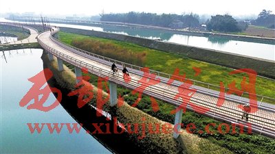 昨日上午,陽光明媚,記者來到剛剛建成的三道堰徐堰河濕地公園,河水清澈見底,河面上微風(fēng)吹拂,楊柳依依,白鷺飛翔,漣漪浪翻?,F(xiàn)場,一座飛架于河面兩側(cè)的“空中綠道”格外引人注目,三道堰鎮(zhèn)工作人員介紹,這座“空中綠道”南側(cè)全長891米,北側(cè)全長1300米,從空中俯瞰猶如雙龍飲水、長虹臥波,取名為“雙虹橋”。該橋?qū)?.5米,可供兩人并肩騎行,這條風(fēng)景獨特的“空中綠道”才建成開放,就已經(jīng)吸引了四面八方的游客前來體驗新鮮,跑步的、散步的、騎行的市民絡(luò)繹不絕。“我們昨天晚上到了這里,橋面沿線彩燈四射,像極了夜空中的彩虹,太美了。”來自天府安公騎游俱樂部的熊大爺說,他們原計劃是一早返回成都,但因為這里的景色太美,一早便騎行到這里希望見到白天的景色。熊大爺在橋上向下望去,一處處水鄉(xiāng)田園美景映入眼簾,人們的跑步聲、嘖嘖的贊美聲傳入耳畔……“這樣的景色使人格外地陶醉!”