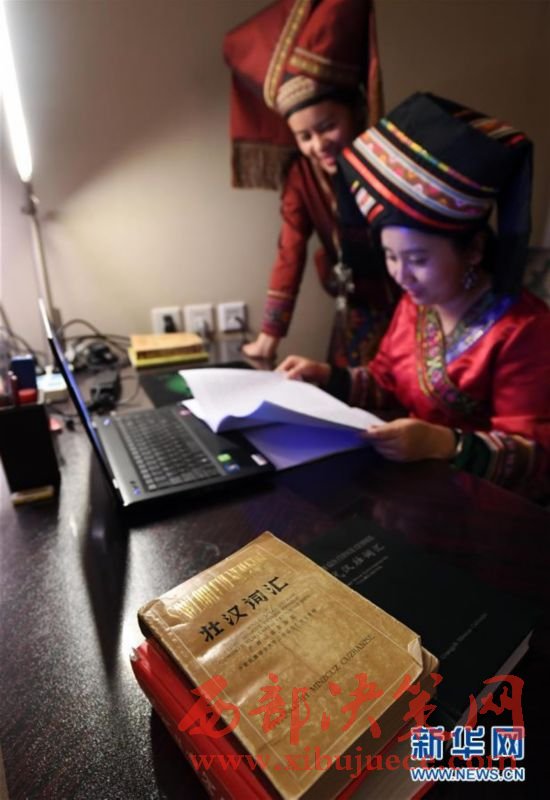 3月7日晚,民族語(yǔ)文翻譯組工作人員藍(lán)玉蘭(左)、覃海戀在為第二天的大會(huì)同聲傳譯做準(zhǔn)備。