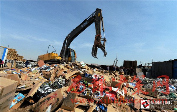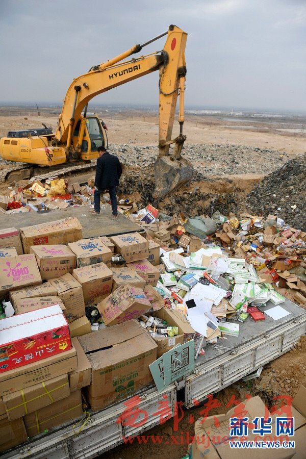 3月14日,在寧夏寧東垃圾填埋場(chǎng),工作人員將假冒偽劣商品進(jìn)行填埋處理。“3·15”國(guó)際消費(fèi)者權(quán)益日即將到來(lái)之際,銀川市市場(chǎng)監(jiān)督管理局集中展示并銷毀食品、藥品、電器等32個(gè)類別的假冒偽劣商品。