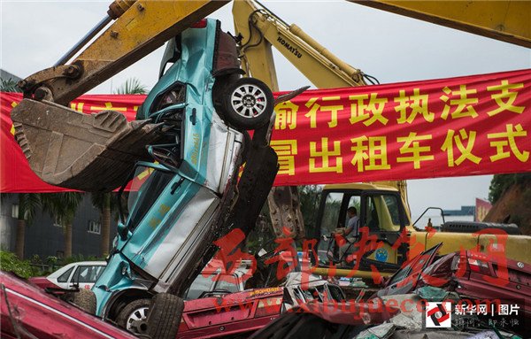 2016年6月16日上午,廣東深圳,深圳市交通運(yùn)輸行政執(zhí)法支隊(duì)在觀瀾大富扣車場(chǎng)舉行公開(kāi)銷毀假冒出租車儀式,對(duì)查扣的484輛假冒出租車依法、公開(kāi)、集中進(jìn)行銷毀。圖為銷毀現(xiàn)場(chǎng),假“的士”在挖掘機(jī)的巨臂下變成廢鐵。