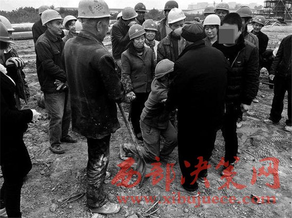 “大爺大媽,我給您跪下了,求求您們了,就讓我們干吧!”就在記者準(zhǔn)備找工地負(fù)責(zé)人了解情況時(shí),一男一女兩位農(nóng)民工突然撲通一聲跪倒在地,抓著其中一位老人的手哭著求情。“我們大伙都給您們跪下了,我們都是下苦人不容易……”看到有人跪地求情,其他農(nóng)民工也齊刷刷跪倒在阻擋者中的兩位老人面前,哭求開恩讓他們干活養(yǎng)家糊口。突如其來的變故,讓阻擋施工的5個(gè)人頓時(shí)慌了手腳。