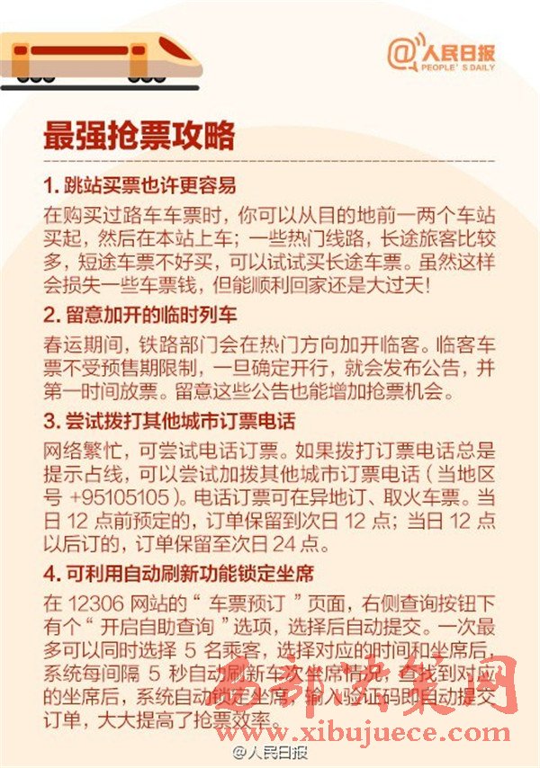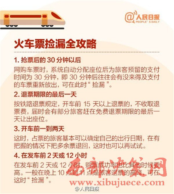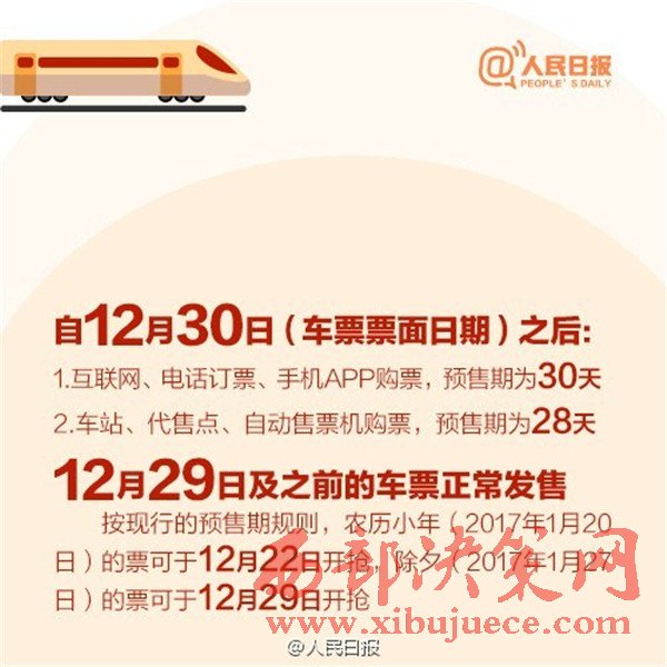 2017年春運(yùn)從1月13日至2月21日,是近5年來開始時(shí)間最早的春運(yùn),你做好搶票準(zhǔn)備了嗎?目前火車票預(yù)售期30天,除夕當(dāng)天的票12月29日開搶,網(wǎng)絡(luò)購票須在30分鐘內(nèi)付款,發(fā)車前2天或12小時(shí)可“撿漏”。