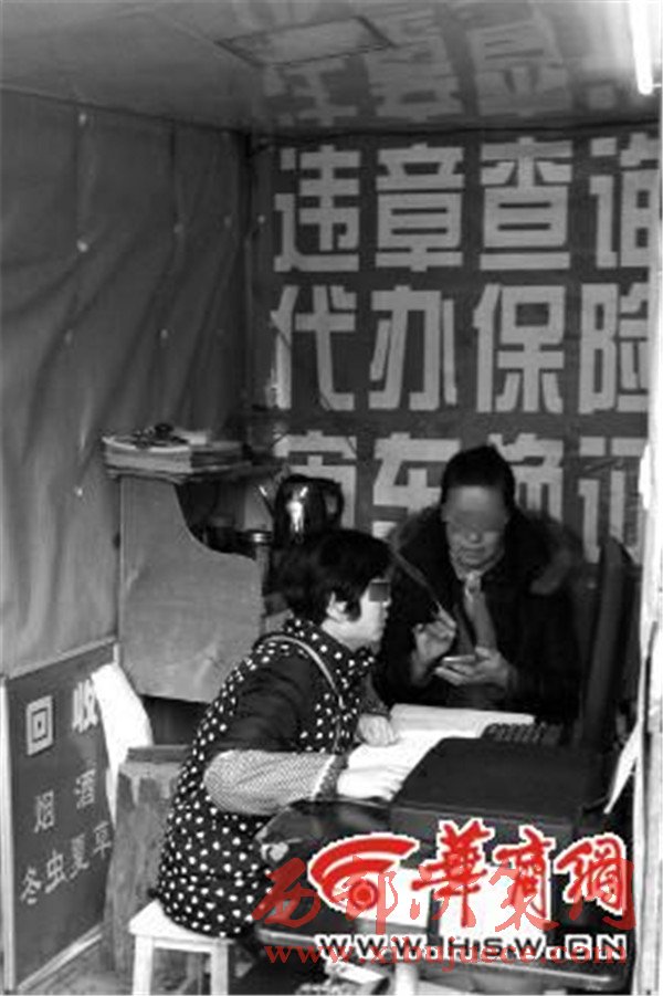 昨日上午9時(shí)許,華商報(bào)記者在這家門店外面看到,門口除了一個(gè)“代辦保險(xiǎn) 違章查詢 復(fù)印”的廣告牌之外,還有“高價(jià)回收,金銀加工回收”的牌子。門店里有個(gè)電腦,一名女子在電腦前不斷地查詢著違法信息。