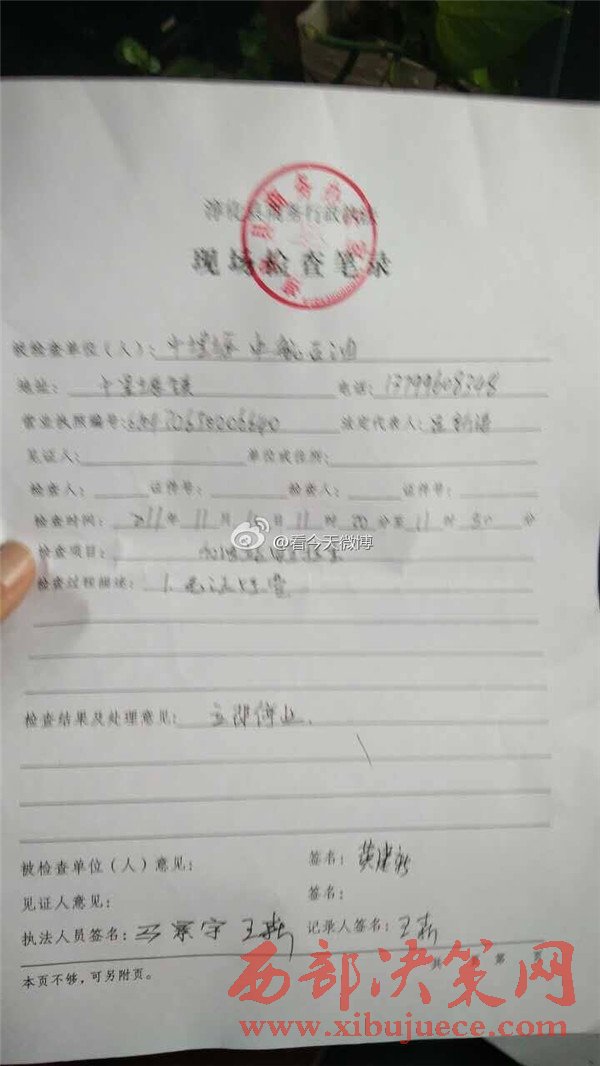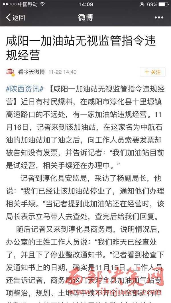 記者到淳化縣安監(jiān)局,采訪了楊副局長(zhǎng),他說(shuō):“我們已經(jīng)讓該加油站停業(yè)了,通知他們辦理相關(guān)手續(xù)。”當(dāng)記者提到此加油站還在經(jīng)營(yíng)時(shí),該局長(zhǎng)表示立馬帶人去查處,查完后給我們回復(fù)。隨后記者又來(lái)到淳化縣商務(wù)局,說(shuō)明情況后,辦公室的王姓工作人員說(shuō):“我們昨天已經(jīng)查處了,并且下了停業(yè)整改通知書(shū)。”記者看到檢查下發(fā)通知書(shū)上的日期,確實(shí)是11月15日。