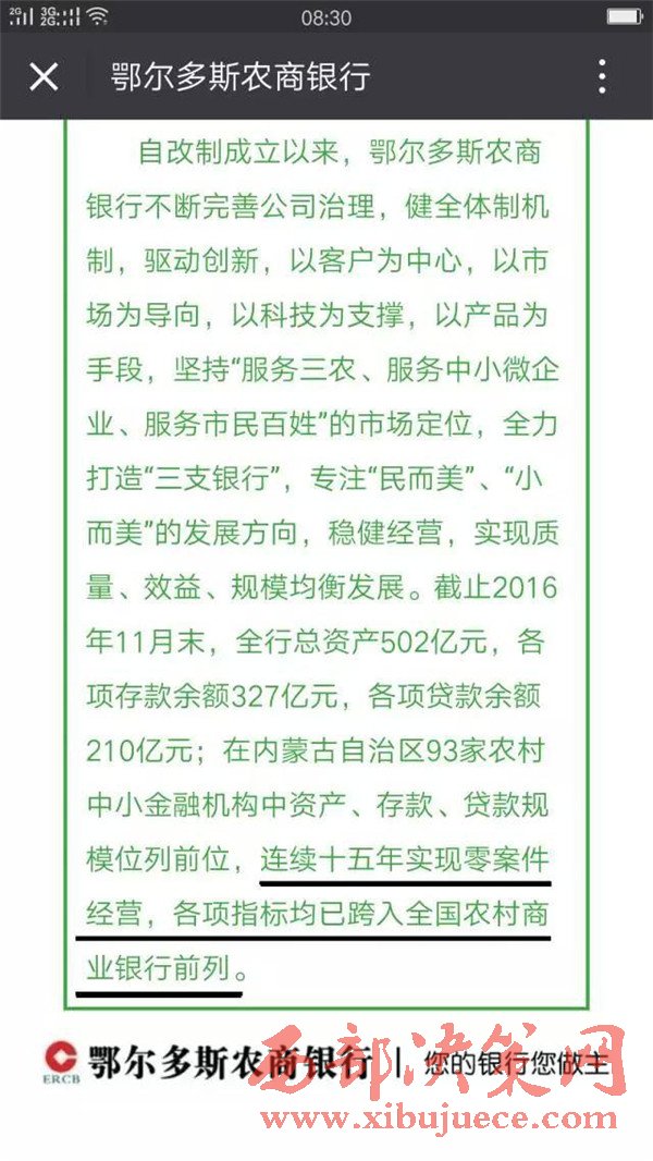 鄂爾多斯農(nóng)商銀行官方微信平臺2016年12月22日發(fā)布文章中稱:鄂爾多斯農(nóng)商銀行自改制成立以來,連續(xù)十五年實現(xiàn)零案件經(jīng)營,各項指標(biāo)均已跨入全國農(nóng)村商業(yè)銀行前列。